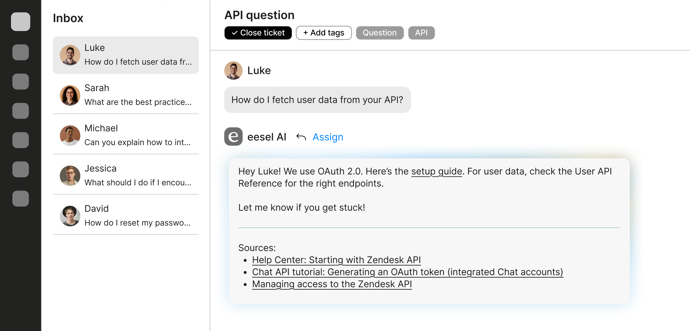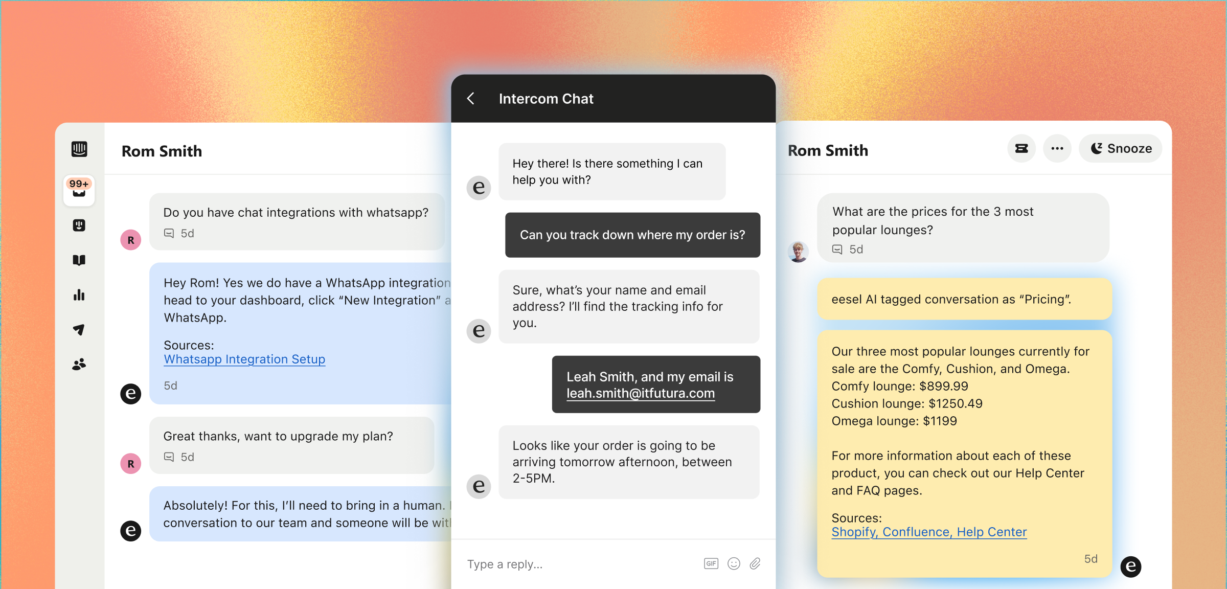 eesel AI instantly plugs into your Intercom, learns from your past tickets, macros, help center and more, and seamlessly joins in like a new teammate.