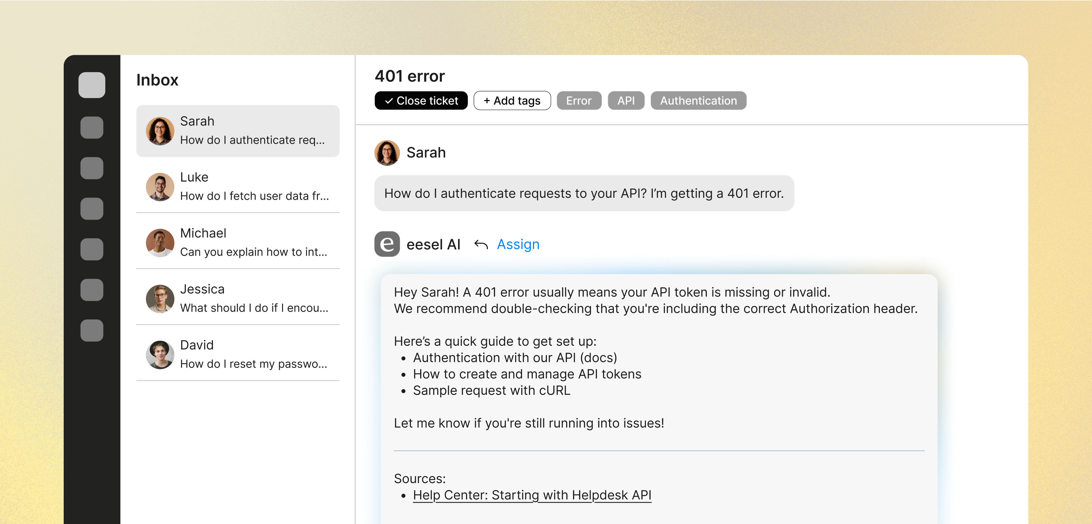 eesel AI instantly plugs into your Jira, learns from your past tickets, macros, help center and more, and seamlessly joins in like a new teammate.